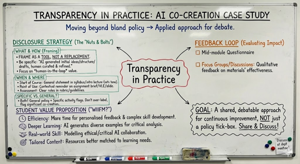 Start by making transparency purposeful rather than performative. A short, student-centred statement early in the module—explaining what you are using AI for, why it benefits learning, and how students should engage critically—sets expectations without repeatedly interrupting teaching. Keep the message consistent by using the same wording across your first session and the VLE, and link it to academic integrity and good scholarly habits so it feels like part of learning rather than an add-on.